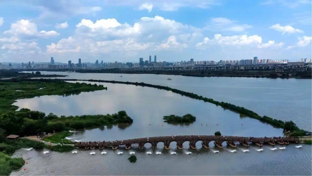 东风坝七孔浮桥一侧可观赏西山睡美人的婀娜多姿,一侧可眺望昆明主城区的城市天际线,桥的设计参考了昆明古八景里的“云津夜市”。