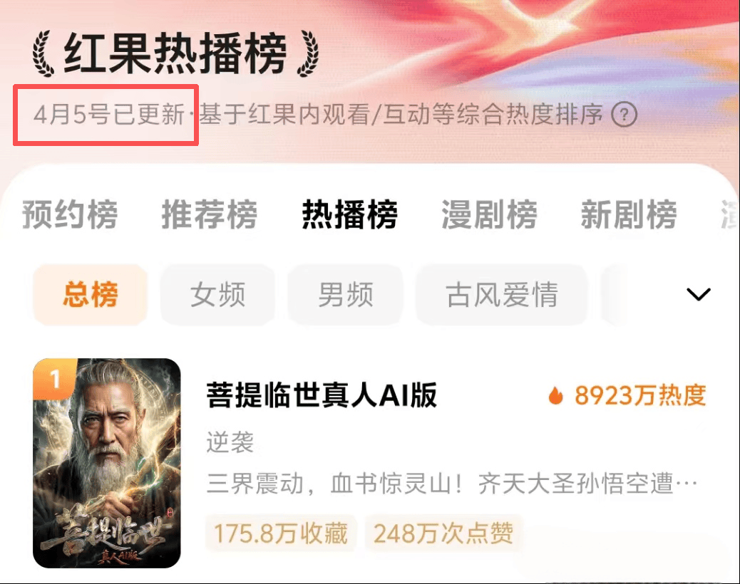 4月5日,一部60集AI短剧《菩提临世真人AI版》以近9000万的热度登顶红果短剧热播榜,首次在流量上全面超越真人实拍剧。