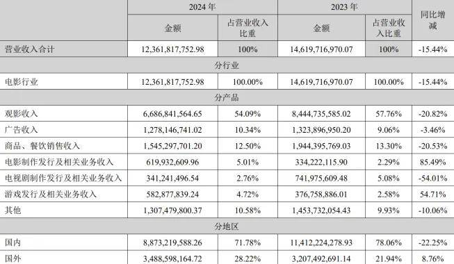 2024年万达电影国内直营影院实现票房64.7亿元,较上年同期下降25.1%,观影人次1.4亿,较上年同期下降23.7%,全年总营收为123.62亿元,同比减少15.44%,归属于上市公司股东的净利润为-9.4亿元。