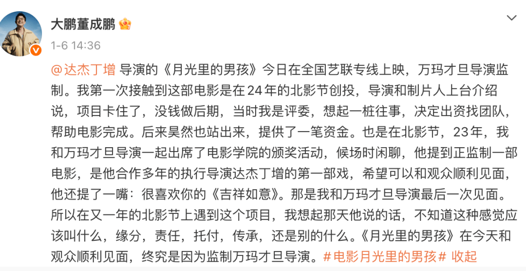 2024年4月在北影节创投单元,《月光里的男孩》拍到后期,导演达杰丁增手里真的一分钱都没了,后期制作眼看就要烂尾。
