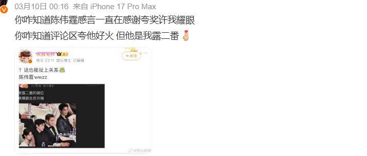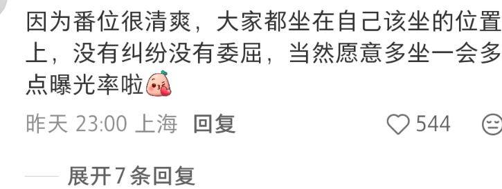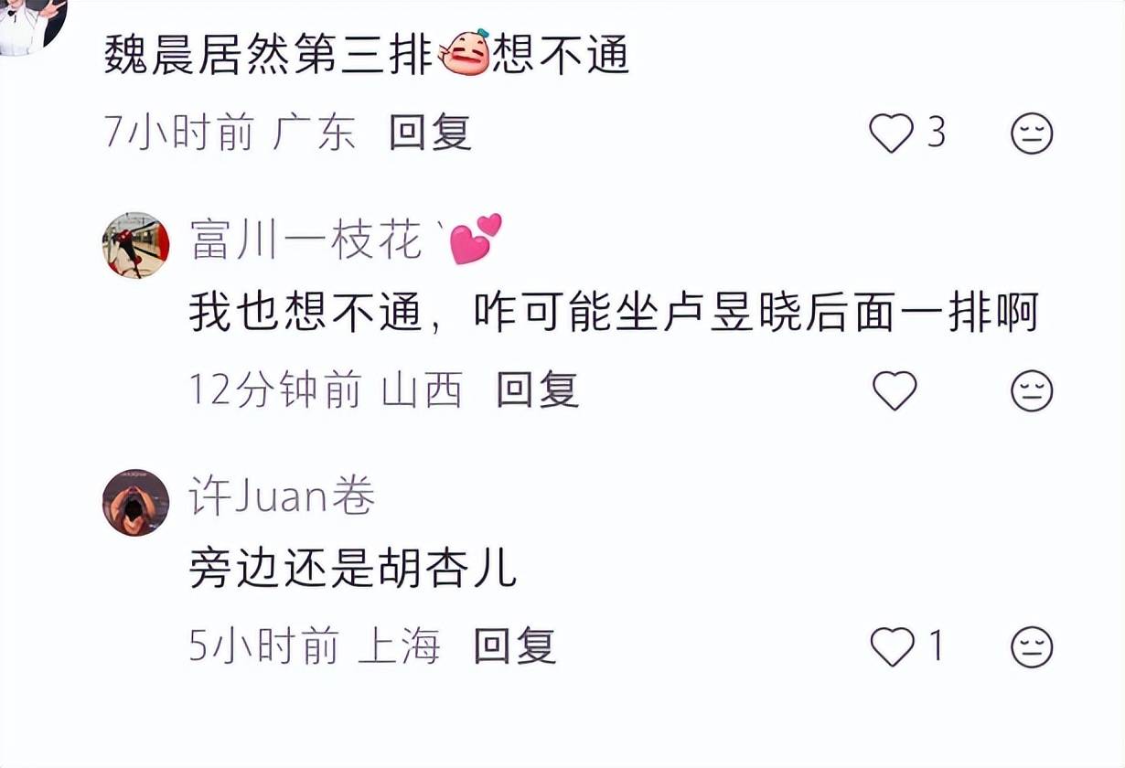 可调侃归调侃,也有不少网友直言,这次的座位仍然不太合理,比如这几年小有作品的魏晨,坐到了最糊的一排,而同场出现的陈伟霆,又坐到了第一排靠近顶流的位置。