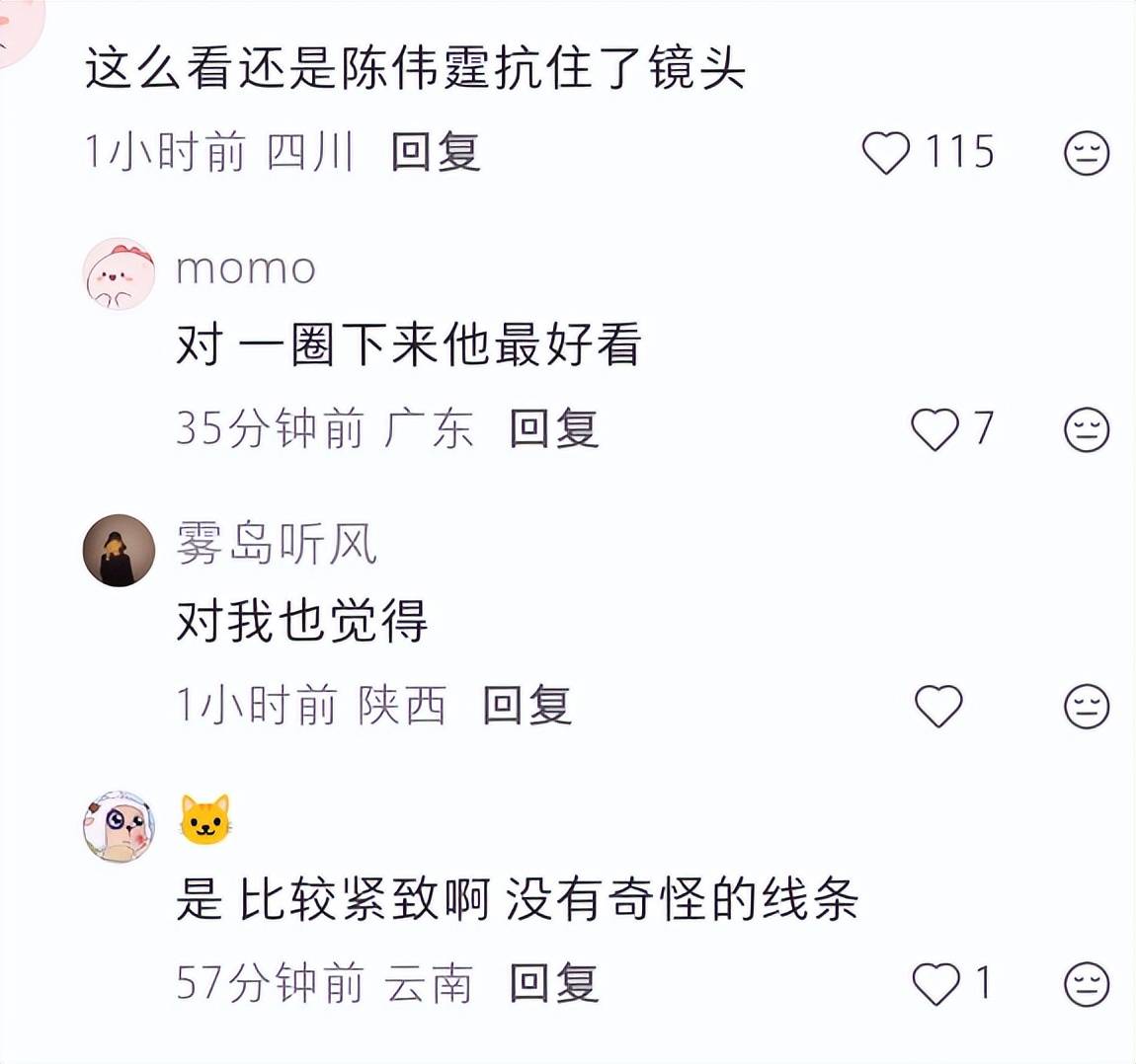 陈伟霆这次的状态倒是很好,在这群明星中完全可以居于第一,脸上线条格外流畅,皮肤光滑,没有多余的赘纹。