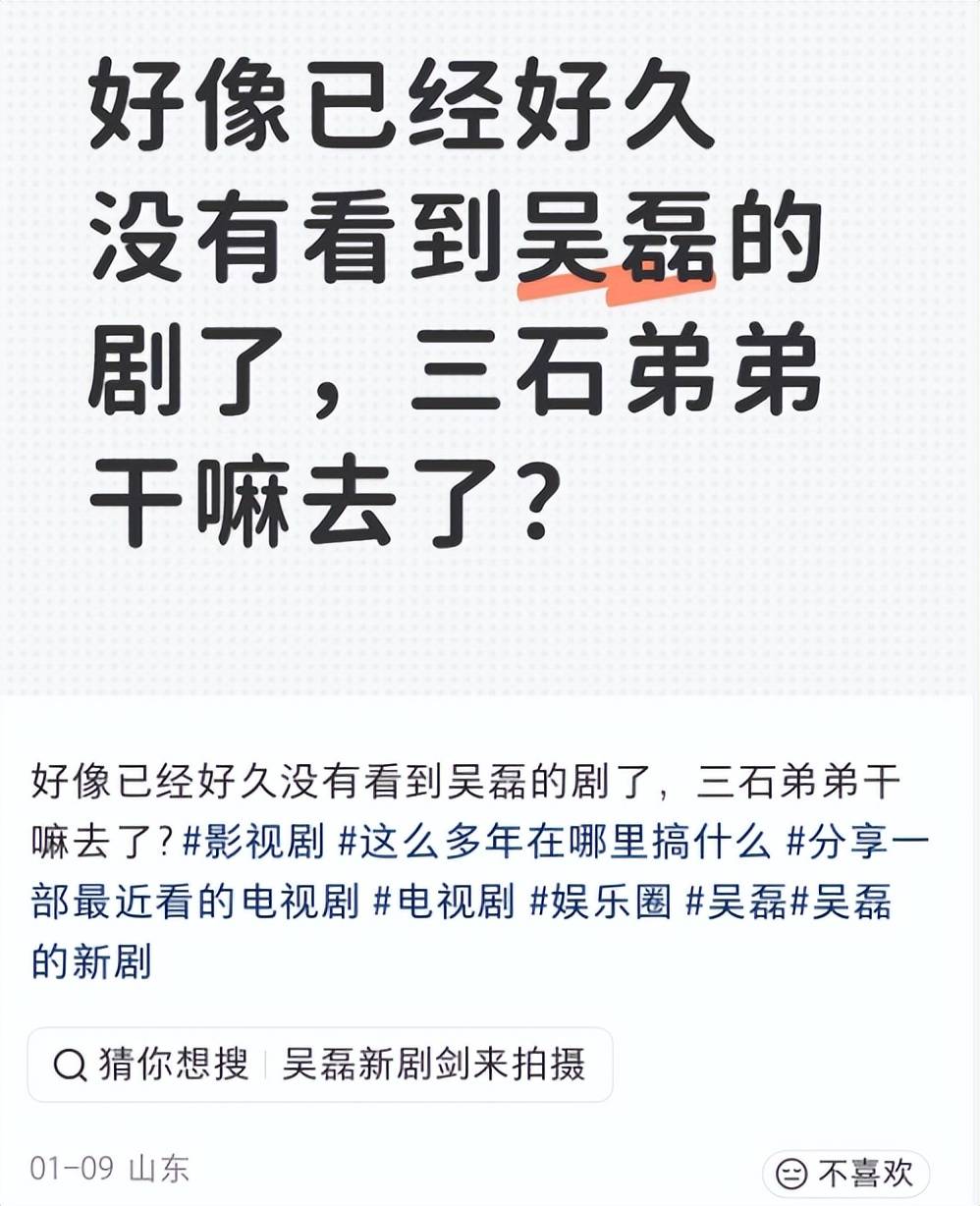 而吴磊本人并不高调爱炒作,这两年事业也有些尴尬,两年只播了两部作品,当一番男主的作品最高热度都没有破万,被嘲得很惨。