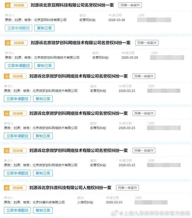 根据律所提供的最新信息,已经以刘源这一艺名,向法院提交了多份名誉权纠纷立案登记申请。