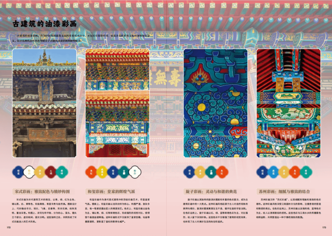 当我们想在色彩搭配上体现传统美学,不需要学习复杂的美学知识,只需要借鉴书中建筑、壁画、古画的色卡就可以了。