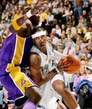 [进攻] 05-06赛季场均26.5分足以说明Melo的得分实力,进攻中以低位要球背身强打为主要进攻手段,厚实的屁股往往可以让他拱到篮下,拿到easy 2。