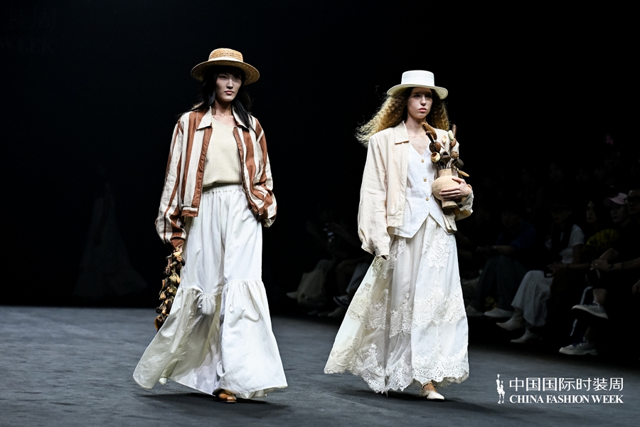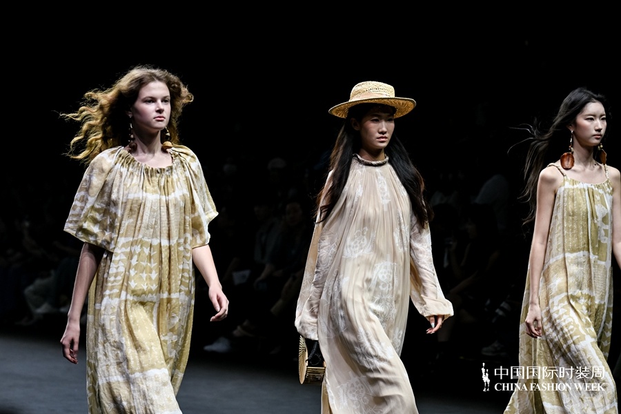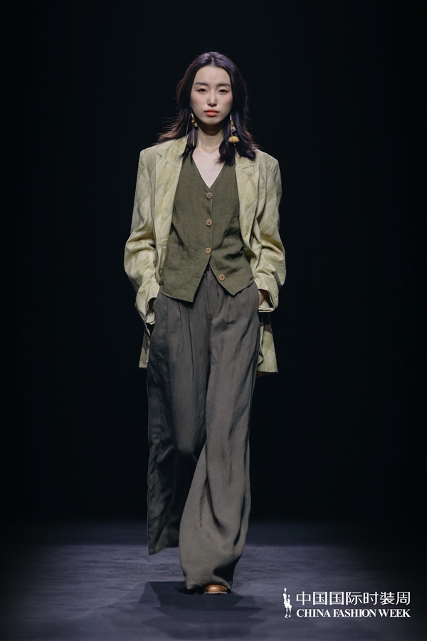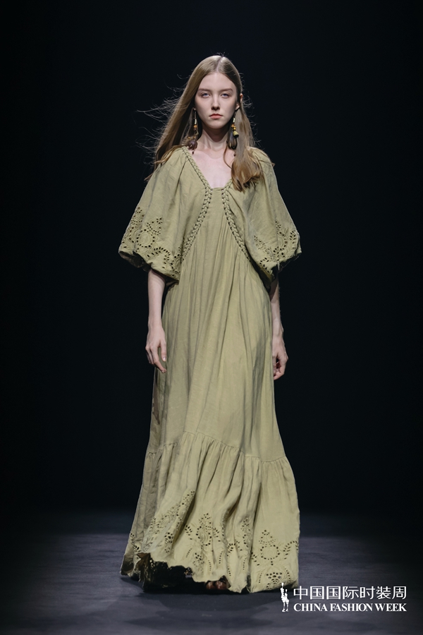 非遗剪纸不再静止于窗格之上,图腾纹样经过抽象化处理,洒落在质朴的亚麻面料上,形成独特的视觉语言;或转化为精细的刺绣图案,穿梭在连衣裙飘逸的下摆与袖口,在行走摆动间若隐若现,诉说着古老传说。
