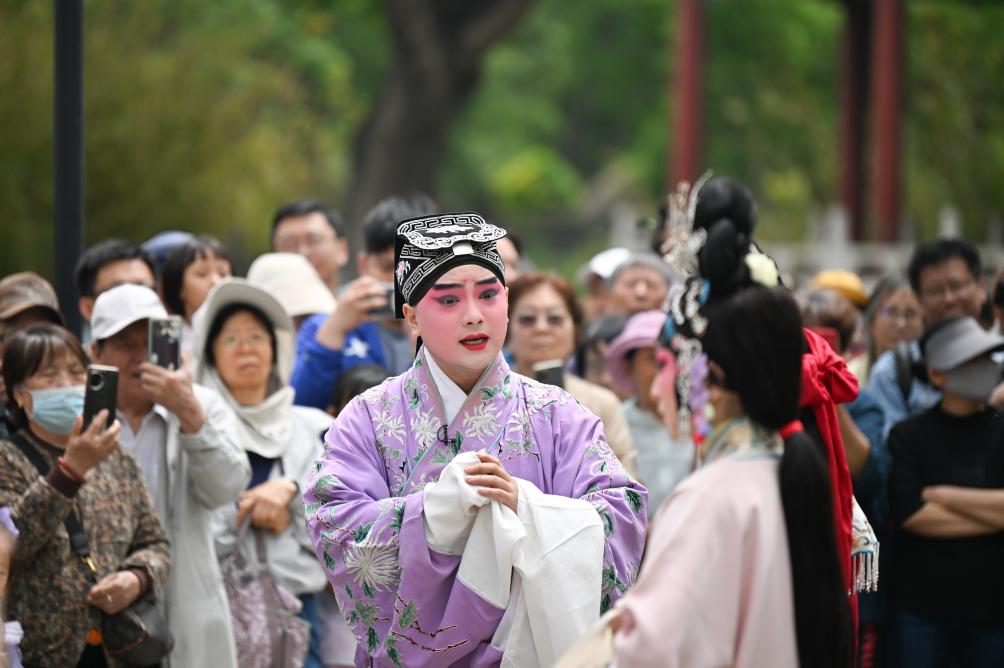 5月5日,演员在天津人民公园为观众表演京剧《西厢记》。