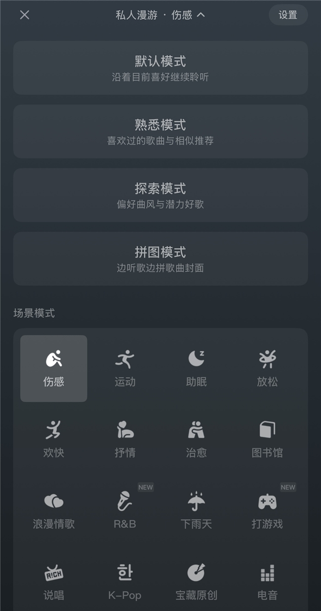 例如,当用户选择“伤感”模式,系统将自动播放符合情绪需要的流行、民谣等歌曲;用户选择“图书馆”模式,可自动聆听放松舒适的钢琴、吉他等纯音乐。