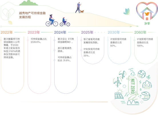 在可持续治理体系的推动下,越秀地产持续深化可持续金融布局,不断探索包括绿色债券、绿色贷款以及与可持续发展绩效挂钩的贷款等多种形式的可持续融资手段以支撑公司的可持续发展,继2024年首次设立可持续融资框架并发行首单绿色债券后,越秀地产在2025年6月成功签订首单可持续发展挂钩贷款,致力于到2060年或之前实现可持续金融占比达100%。