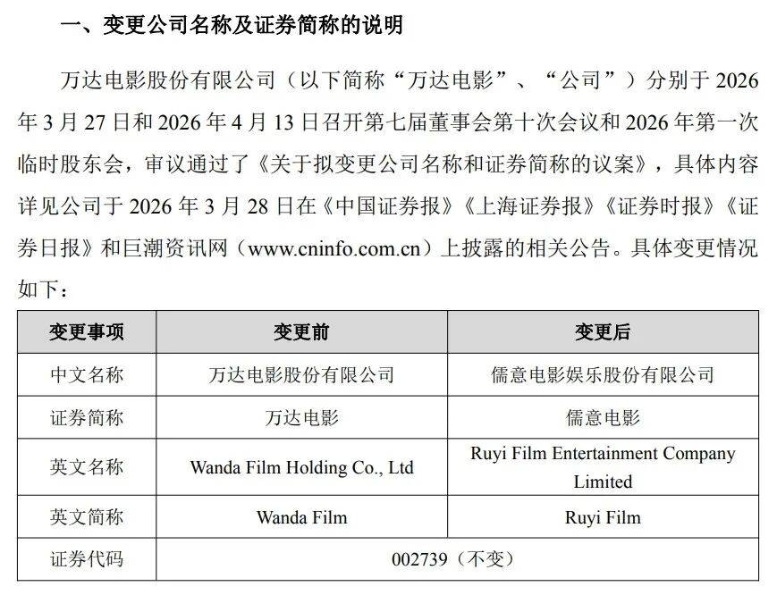 2026年3月27日,万达电影曾预告称,公司即将更名。