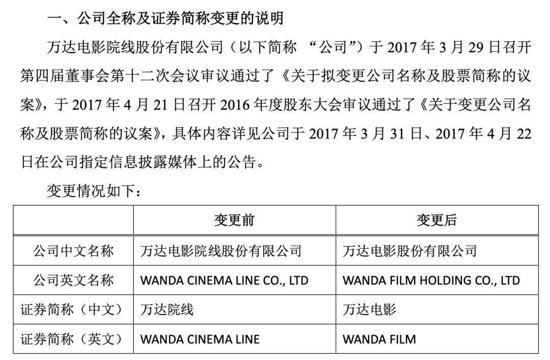 到了2017年,万达院线作为“中国院线第一股”,宣布将证券简称改为“万达电影”,公司名称也由“万达电影院线股份有限公司”更名为“万达电影股份有限公司”。