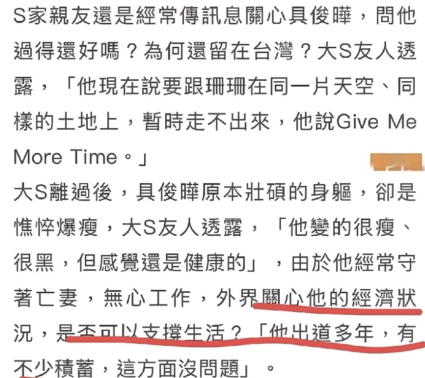 具俊晔一直守墓,没有工作,经济会不会受到影响?大S的朋友竟然代他回答,说具俊晔出道多年,还是有一些积蓄的,就是现在不工作,经济状况不用担心。