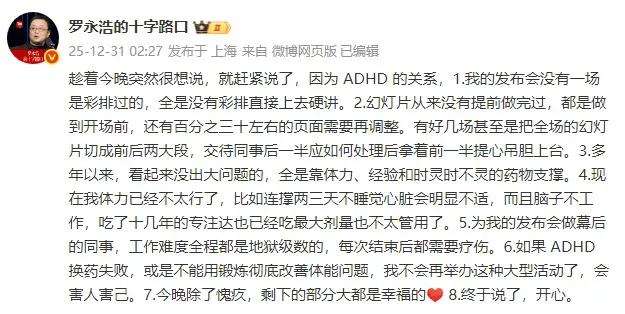 此前,罗永浩也自称患有ADHD,其表示多年以来,全是靠体力、经验和时灵时不灵的药物支撑。