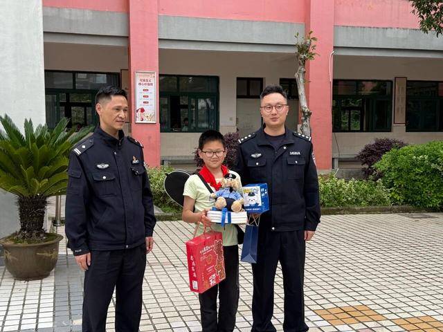 为表扬他热心助人的行为,4月16日中午,越城公安分局基层基础管理大队与鉴湖派出所一道专程来到校园内,为遇事临危不乱的黄子轩当面颁发“安全小使者”特别奖状,并赠送了警熊和礼品。