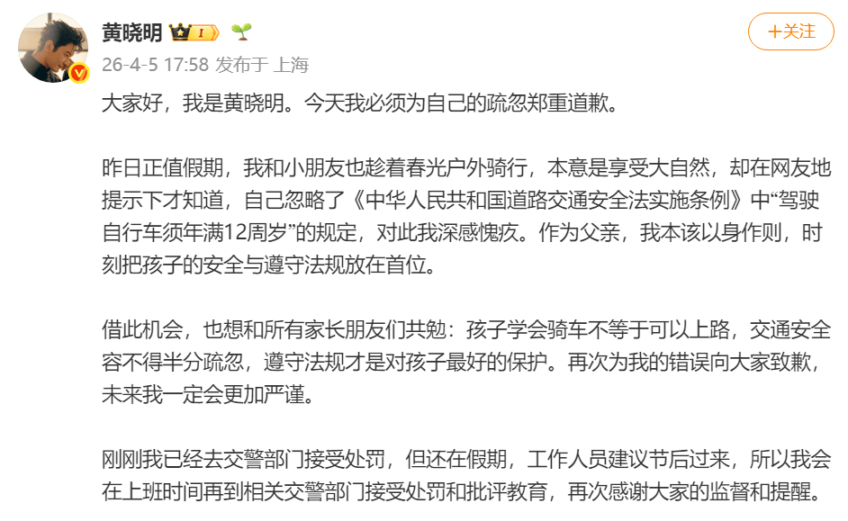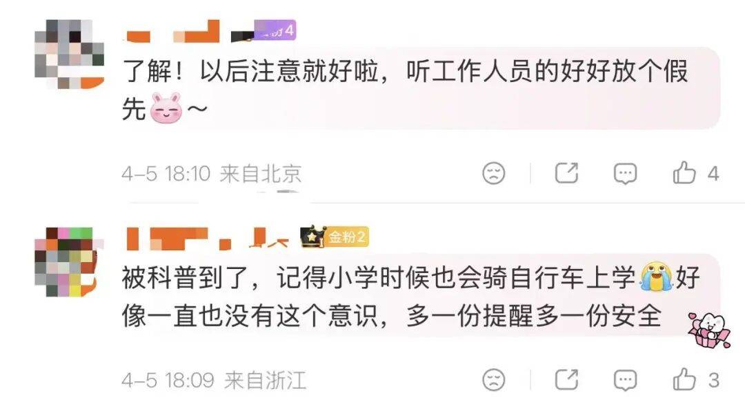 昨日正值假期,我和小朋友也趁着春光户外骑行,本意是享受大自然,却在网友地提示下才知道,自己忽略了《中华人民共和国道路交通安全法实施条例》中“驾驶自行车须年满12周岁”的规定,对此我深感愧疚。